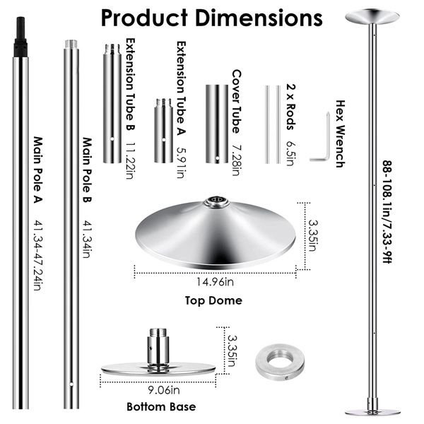 Adjustable Height: Come with 2 main poles and 2 extension tubes, this dancing pole can be adjusted from 88in to 108.1in, compatible with the ceiling of different height. Designed with anti-slip silicon rings around the top and bottom domes to prevent ceiling and floor from scratches and ensure firm installation.